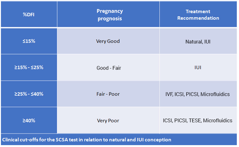 The authors concluded that “DFI is a predictor of the likelihood of natural conception, even when classic semen parameters are within the normal range. The SCSA analysis complements treatment planning for couples with proven infertility.”