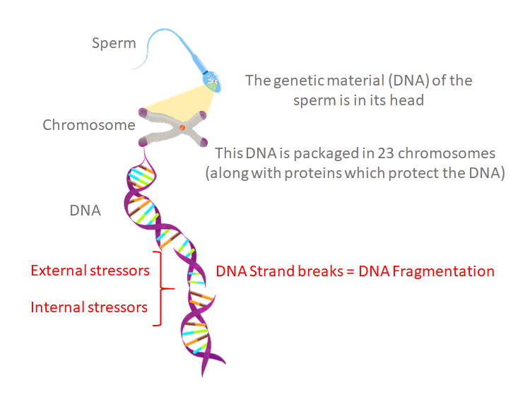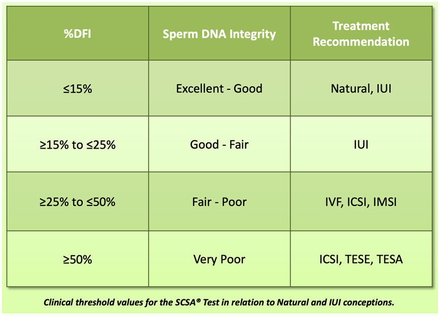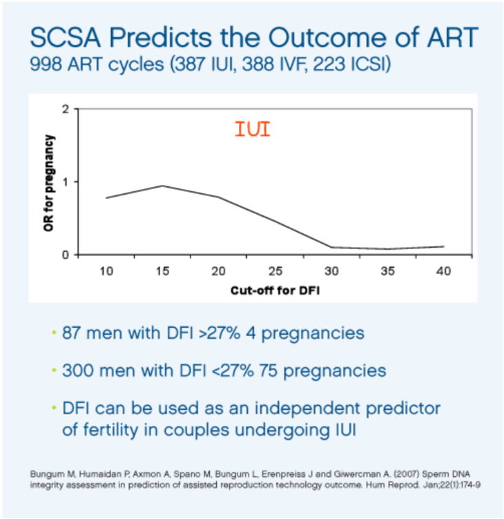 Alguns autores publicaram que amostras de sêmen que contêm mais de 27-30% de espermatozoides com fragmentações do DNA (% Índice de Fragmentação do DNA) têm de 7 a 10 vezes menor chance de engravidar por meio de relação sexual ou IIU e uma chance 1,5 a 2,0 vezes menor por meio de FIV/ICSI.