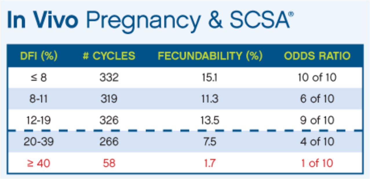 Os dados atuais mostram que a probabilidade de uma gravidez bem-sucedida é significativamente menor quando a proporção de espermatozoides com DNA fragmentado é >25%. No entanto, um Índice de fragmentação do DNA >25% não descarta a gravidez. O limite de 25% é um limite estatístico. Se um homem tem um Índice de fragmentação do DNA constante de >25%, ele é colocado em um grupo estatístico que tem mostrado em testes clínicos que leva mais tempo para alcançar a gravidez naturalmente e requer mais ciclos de fertilização in vitro (FIV). Uma taxa aumentada de abortos espontâneos está associada a isso ou a gravidez não ocorre de forma alguma.