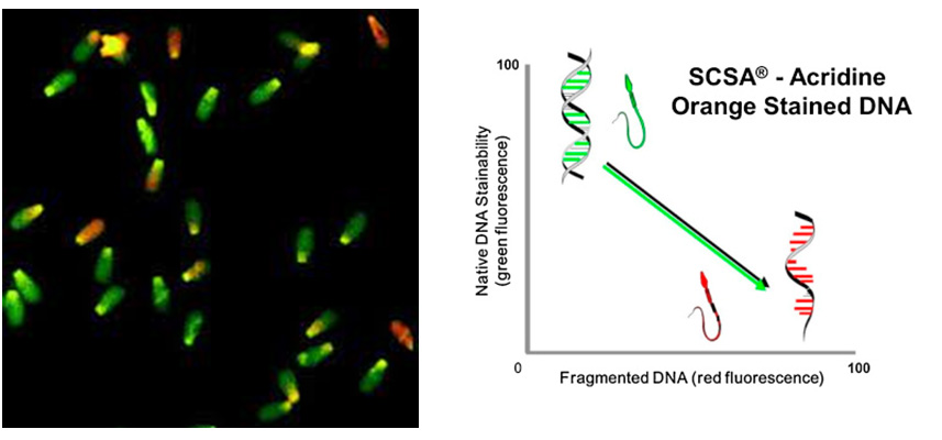 No teste SCSA®, devido à natureza única do corante Laranja de Acridina, os espermatozoides que emitem fluorescência verde têm níveis indetectáveis de DNA fragmentado, enquanto os espermatozoides que emitem uma fluorescência de amarela à vermelha têm níveis moderados a altos de DNA fragmentado.