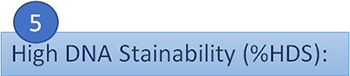 Porcentagem de espermatozoides com cromatina imatura. Os espermatozoides de Células de alta coloração de DNA apresentam menor condensação de cromatina, resultando em maior corante de marcação de DNA. Alguns estudos têm demonstrado que, se a porcentagem de Células de alta coloração de DNA for superior a 36%, nenhuma gravidez ocorreu (Menezo).