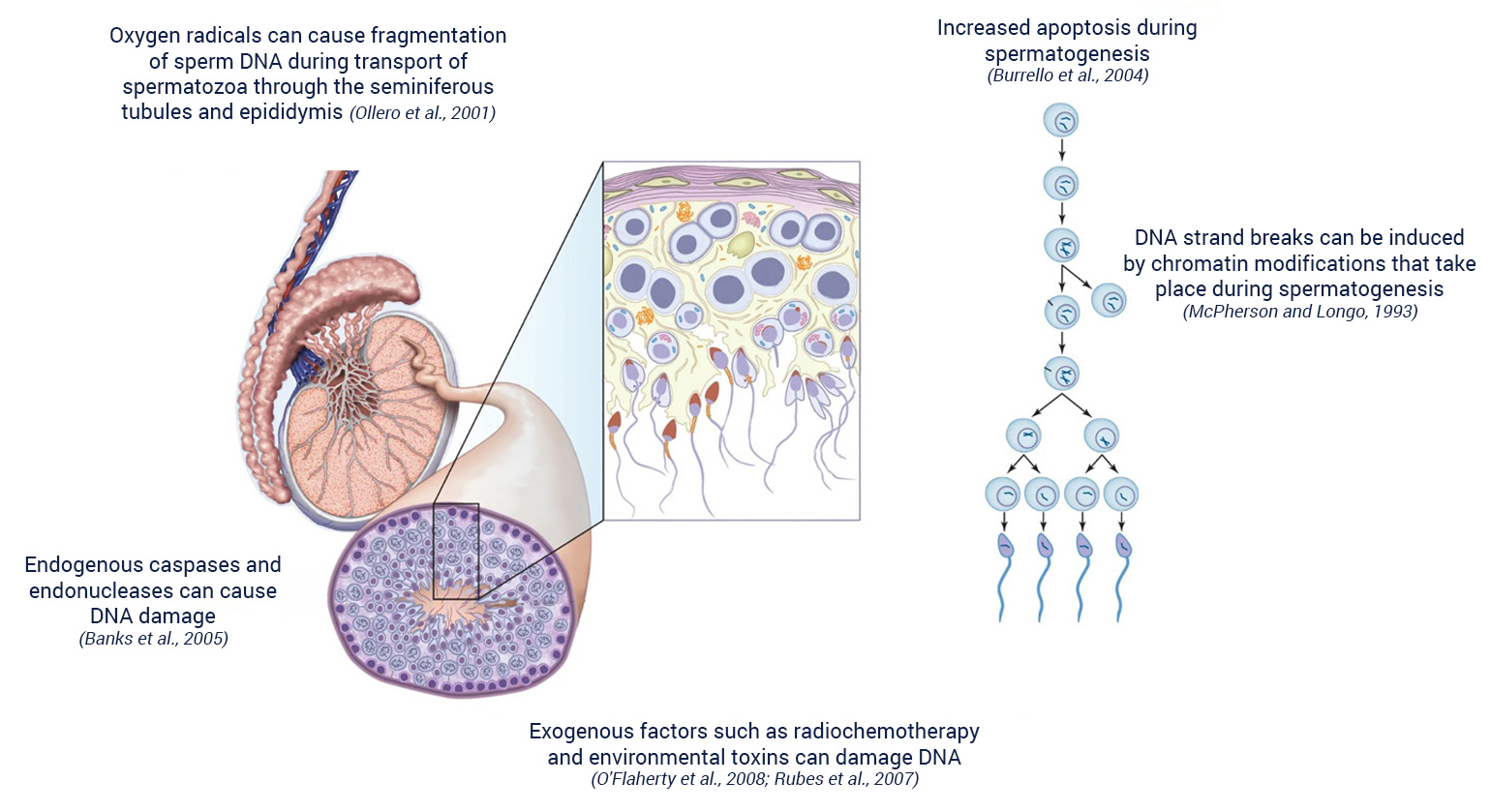 Os danos ao DNA do espermatozoide podem resultar de cinco mecanismos patogênicos diferentes (Perrin et al., 2011; Sakkas e Alvarez, 2010).
